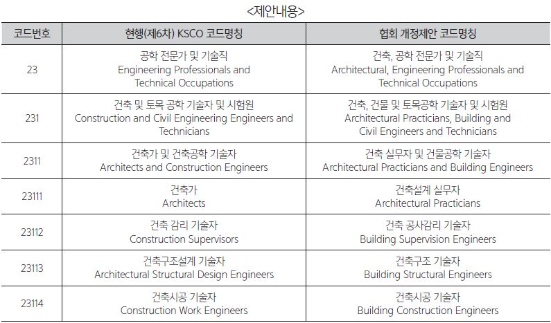이밖에 협회는 코드번호 23112 ‘건축 감리 기술자(Construction Supervisors)’를 ‘건축 공사감리 기술자(Building Supervision Engineers)’로, 코드번호 23113 ‘건축구조설계 기술자(Architectural Structural Design Engineers)’을 ‘건축구조 기술자(Building Structural Engineers)’로, 코드번호 23114 ‘건축시공 기술자(Construction Work Engineers)’을 ‘건축시공 기술자(Building Construction Engineers)'로 제안했다.