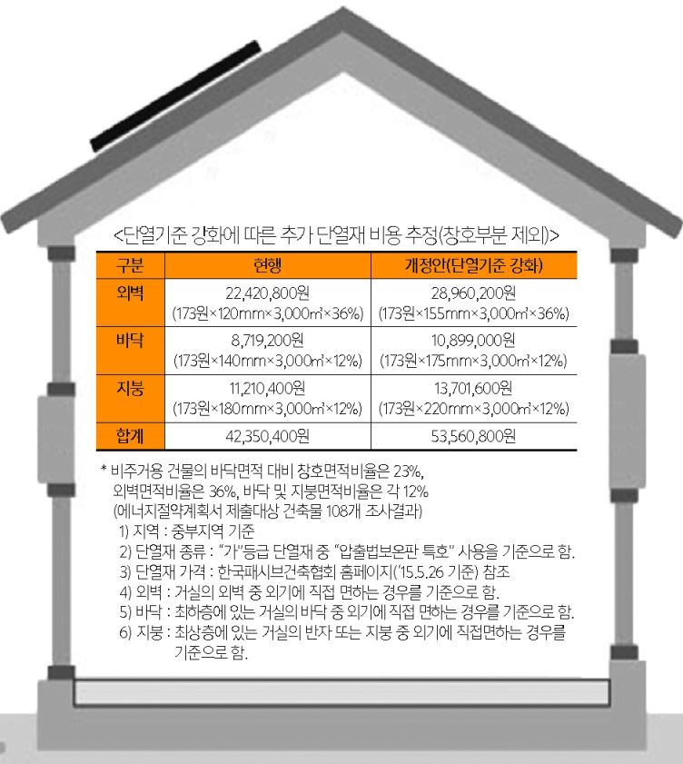 공사비 상승도 무시할 수 없는데 이번 개정안으로 바닥면적 3,000㎡ 건축물인 경우 외벽, 바닥, 지붕의 단열재 비용만 1100만원 가량의 추가비용이 발생할 것으로 예상된다. 건축사협회 관계자는 "2014년 한 해 동안 건축허가건의 연면적 합계가 138,049,540㎡인 점을 감안하면 연간 약 5천억 정도의 추가비용이 발생된다"며, "강화된 열관류율을 충족하기 위한 창호비용 증가와 시공비용 등을 감안하면 그 이상이 될 것"이라고 말했다.