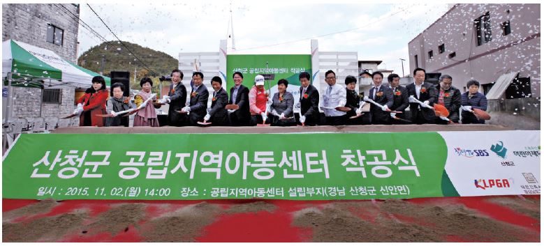 11월 2일 경남 산청군에서 지역 어린이들을 위한 희망의 첫 삽을 떴다. 산청군 주민들과 지역 전문가 단체장들, 교육관계자들이 자리를 함께 해 공립지역아동센터 설립을 반겼다. 대한건축사협회 경상남도건축사회와 SBS, 초록우산어린이재단, KLPGA(한국여자프로골프협회)가 후원하는 산청군공립지역아동센터 착공식이 개최된 것.