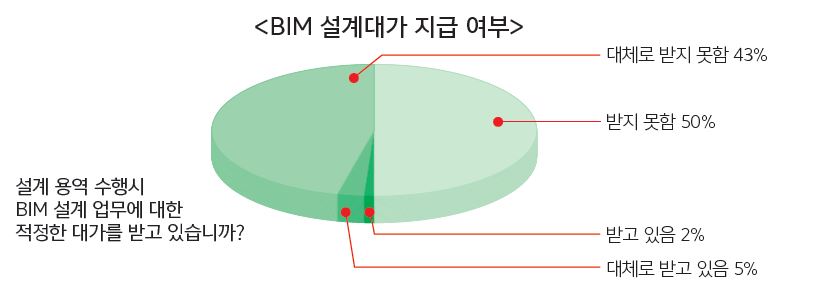 건축연구원이 수행하고 있는 ‘BIM 정책 및 제도의 중장기 전략’ 보고서를 보면 적정대가를 받고 있다고 응답한 비율이 1.7%, 대체로 받고 있다고 응답한 비율 또한 5.2%로 매우 낮은 것으로 나타났다. 나머지 93.1%는 대체로 받지 못하거나 아예 받지 못하고 있는 것으로 나왔다.