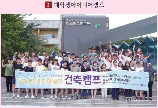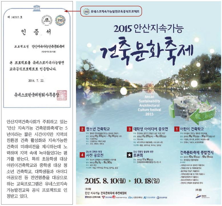 이러한 시대적 필요성에 건축계의 지속가능발전교육의 표본을 제시하는 활동이 지역사회에서부터 시도되고 있어 눈길을 끈다. 안산지역건축사회의 ‘안산지속가능건축문화축제’다. 지난 5년 동안 전 연령층을 대상으로 하는 건축교육프로그램과 사회공헌활동을 인정받아 유네스코지속가능발전교육 공식프로젝트로 지정됐다. 초등학생 대상의 어린이 건축학교와 중학생 대상의 청소년건축학교, 대학생대상의 아이디어캠프, 시민들과 함께하는 사진공모전과 정책토론회, 좋은마을만들기지원센터 등이 안산지역건축사회의 주최로 진행되고 그 결과물들은 건축문화축제 종합전시를 통해 공유된다. 지역사회와 함께 발맞춰 나가며 발전하는 건축교육의 모범사례로 평가받는 지속가능건축문화축제를 들여다보았다.