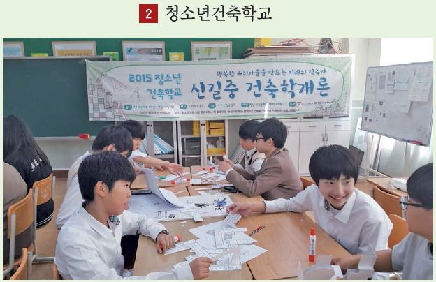 ‘함께 꿈꾸는 행복한 우리학교, 우리 마을’이라는 주제로 중학생 대상 건축교육프로그램인 청소년건축학교. 단발적인 이론 강의에서 벗어나 매년 한 학교를 정해 12주 동안 밀도 있는 교육프로그램이 진행된다.