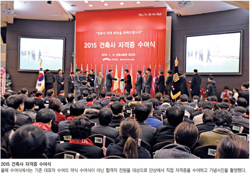 실제 주인공이 돼야할 합격자들의 배려가 미흡하다는 평가였다. 이에 올해 수여식은 실제 건축사 업무에 필요한 정보들을 교재로 제작·배부하여 교육시간은 대폭 줄이고, 자격증 수여에 초점을 맞춰 합격자 전원에게 단상에서 직접 자격증을 수여하고 기념사진을 촬영했다.