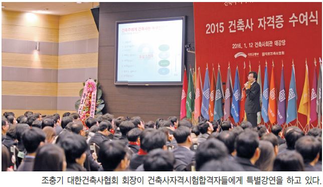 1월 12일 서초동 건축사회관 1층 대강당에서 오전 오후로 2차례에 걸쳐 건축사자격증 수여식이 개최된 것. 이날 건축사자격증 수여식에선 최종합격자 외 조충기 대한건축사협회 회장 및 임원, 시도건축사회 회장들과 합격자 축하객들로 성황을 이뤘다.