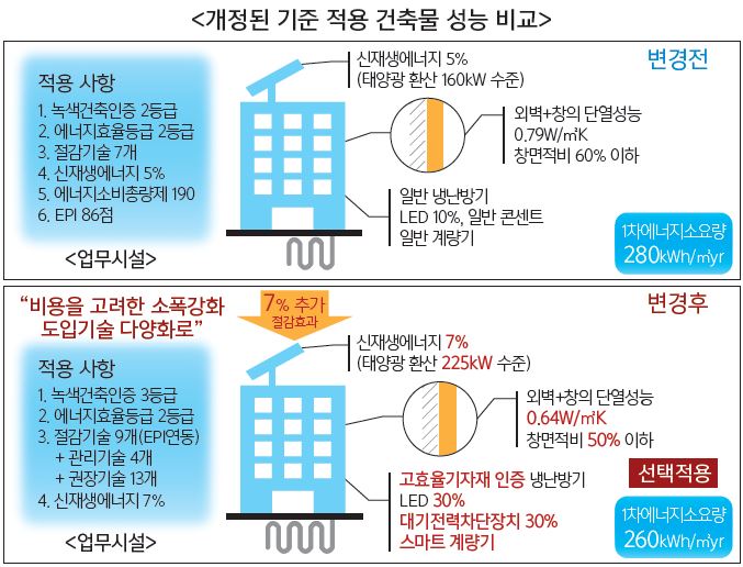 설계기준에 패시브 요소도 다양화됐다. ▶ 건축부문은 창호기밀, 결로방지, 자연환기 ▶ 기계부문은 고효율 인증제품에 열원설비와 폐열회수장치 ▶ 전기부문은 대기전력차단장치 등이 추가 도입됐다. 이와 함께 신축 대형건축물의 외벽, 지붕, 바닥 등 단열성능을 현재 대비 8%∼20%까지 강화한다는 계획이다.