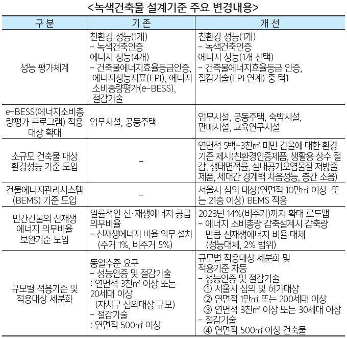 개정된 녹색건축물 설계기준을 살펴보면, 먼저 건축물의 에너지 성능 평가체계가 기존 5개 항목에서 2개 항목으로 축소됐다. 이전에는 녹색건축인증, 건축물 에너지효율등급 인증, 에너지성능지표(EPI), 절감기술, 에너지소비총량평가(e-BESS) 등 5개 항목이었지만 유사한 평가항목을 정리해 친환경 성능차원의 녹색건축인증과 함께 에너지성능과 관련한 건축물에너지효율등급 인증·절감기술 중 하나를 택하도록 해 총 2개로 현실화했다.