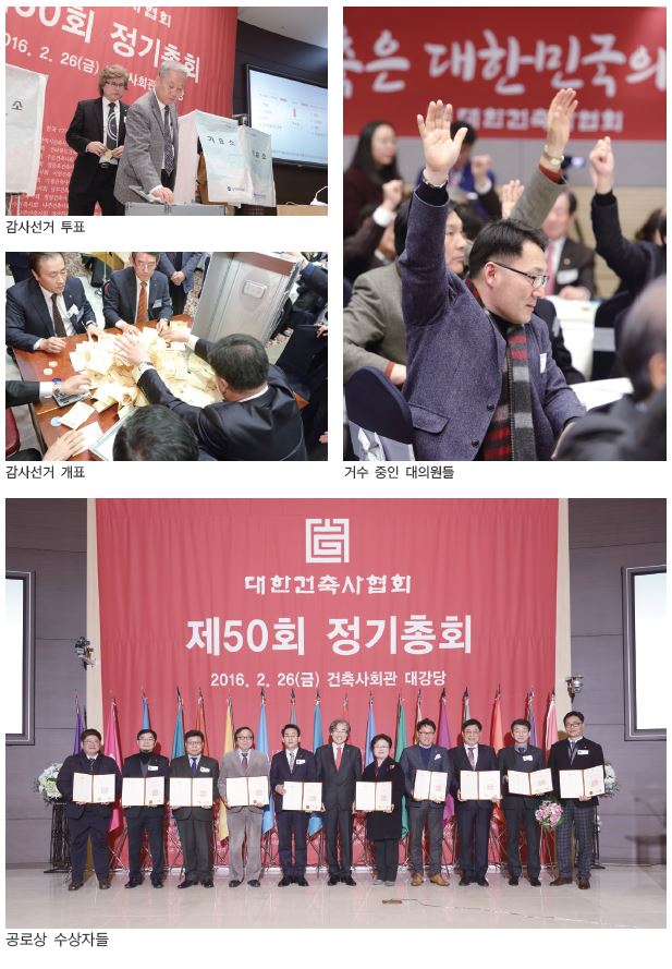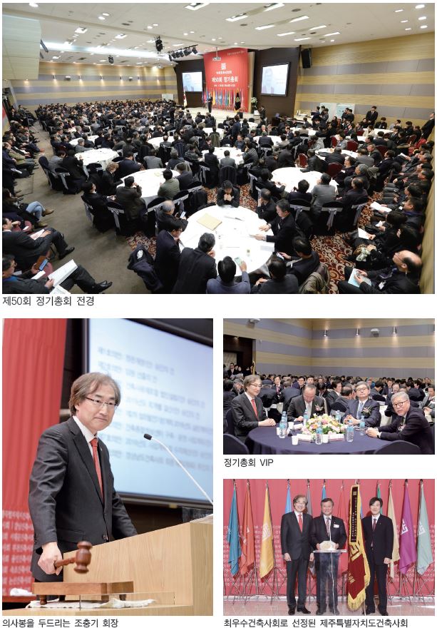 “우리 협회는 50년 협회역사에 걸맞게 강력한 협회미래를 그려나가야 합니다. 건축시장의 패러다임이 변화하고 있습니다. 신축 보다는 노후주택정비와 그린 리모델링·리뉴얼, 건축물유지관리, 결합건축, 협정건축, 건축 및 주거성능진단 등으로 업무의 형태가 다양화, 전문화되고 있으며, 건축관계법령과 제도 역시 수시로 변경되고 있습니다.”