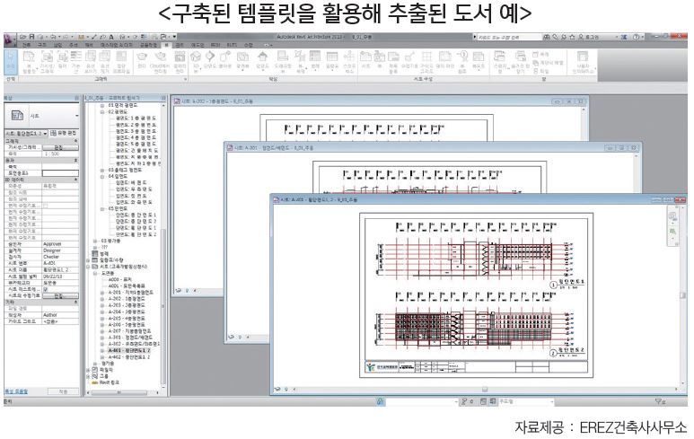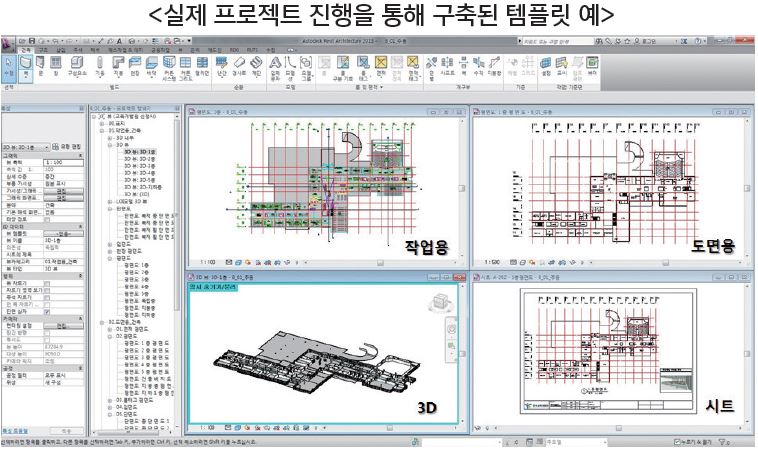 을 크게 절약할 수 있다. 또한 회사가 반복적으로 작업하는 방식과 도서추출을 위한 시간을 줄이기 위해 미리 세팅해 놓은 바탕을 BIM에서는 템플릿이라고 하는데 이것도 다수의 프로젝트를 통해 자연스럽게 구축될 것이다. 이러한 템플릿이나 라이브러리를 사용하여 BIM템플릿에서 일반적인 도면 수준의 도면을 작성하기 위한 선의 종류, 두께, 문자 등을 조정해 놓는다면 건축설계 시 사용할 수 있는 도면을 쉽게 추출할 수 있다.