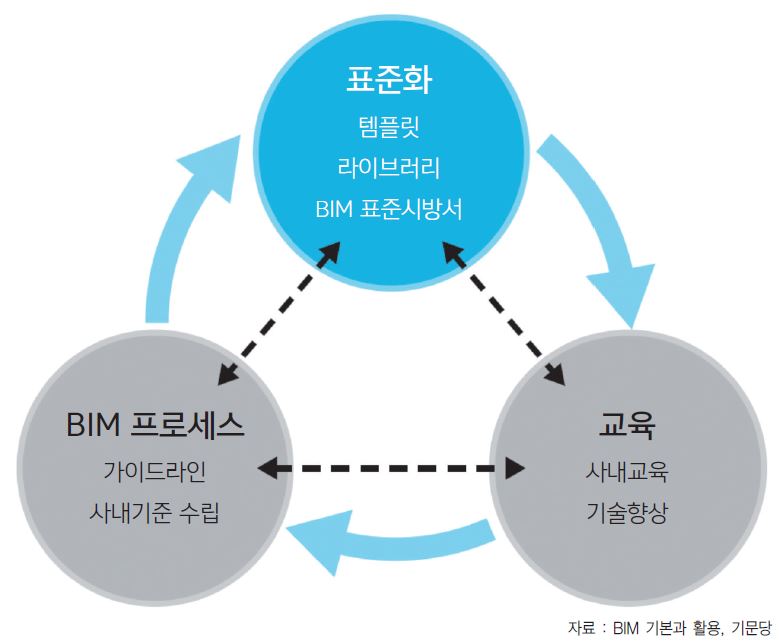 BIM을 조직에서 활용해 업무효과나 생산성을 개선해 가기 위해서는 사내의 설계자가 제각기 하고 싶은 대로 BIM소프트웨어를 사용하는 것만으로는 불충분하다. 그래서 조직적으로 활용하기 위한 3요소로 ‘표준화’, ‘BIM프로세스화’, ‘교육’을 꼽을 수 있다. ‘표준화’란, BIM모델로부터 도면작성을 시행하기 위한 템플릿이나 라이브러리 등의 표준시방서 혹은 매뉴얼을 사내에서 구축하는 것이다. ‘BIM프로세스화’는 BIM데이터를 작성하기 위한 일종의 가이드라인을 구축하여 설계단계별 혹은 공정별 업무의 흐름에 따른 사내 BIM절차 및 제도기준을 정하는 것이다. ‘교육’은 사원교육을 통해 위의 내용을 숙지시키고 BIM기술을 향상시키기 위한 목적으로 수행하는 요소다.