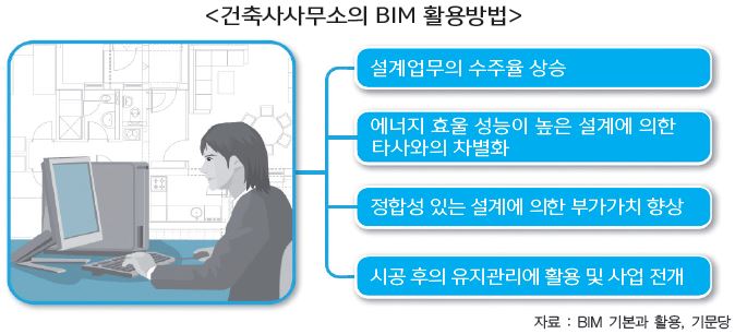 건축사사무소는 프로젝트 수주 전에 대상지 주변환경 분석이나 설계내용의 프레젠테이션에 BIM을 활용해 수주율을 높일 수 있다. 프로젝트 진행과정에서는 에너지 해석이나 간섭 없는 도면 작성, 더 나아가 건축물 준공 후 유지관리업무까지를 목표로 한 전개가 가능하다.