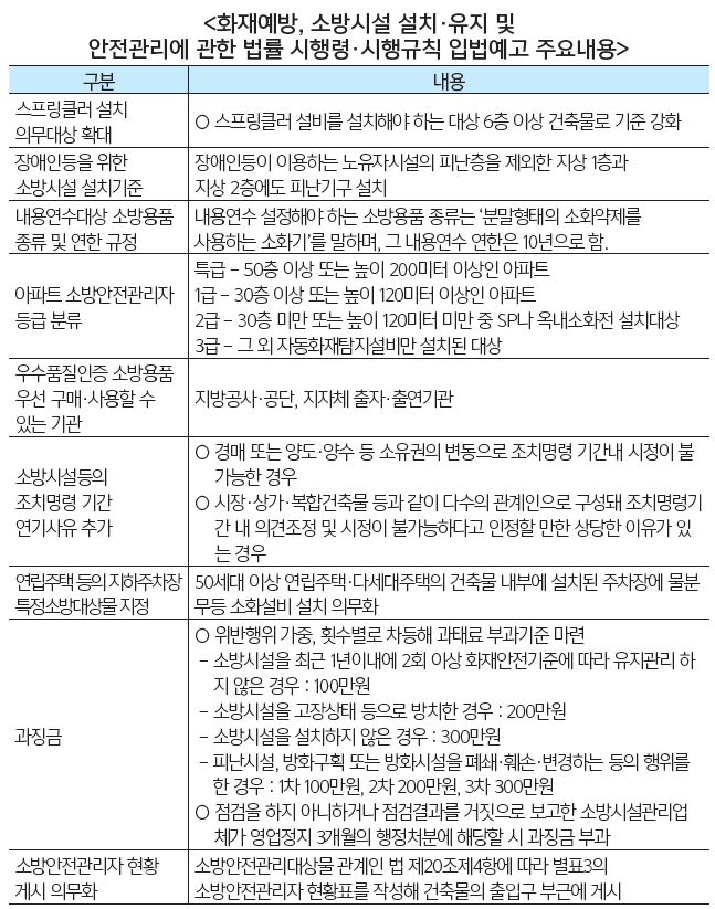 앞으로 스프링클러 설비 설치대상이 기존 11층 이상에서 6층 이상 건축물로 강화된다. 또 50세대 이상 연립주택·다세대주택의 건축물 내부에 설치된 주차장에도 물분무등 소화설비를 설치해야 한다. 장애인등이 이용하는 노유자시설에는 피난층을 제외한 지상 1층과 지상 2층에도 피난기구 설치가 의무화된다.