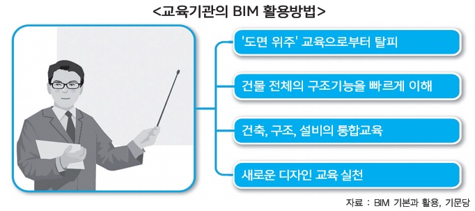 BIM에 대한 관심이 고조되어 우리나라에서도 많은 대학의 건축학과에서 BIM을 도입하기 시작했다. ‘도면위주’ 교육에 비해 BIM모델은 건물 전체의 구조를 이해하기 쉽고 건축과 구조, 더나아가 설비를 조합한 통합적인 건축지식을 몸에 익혀 나갈 수 있다는 장점이 있다.