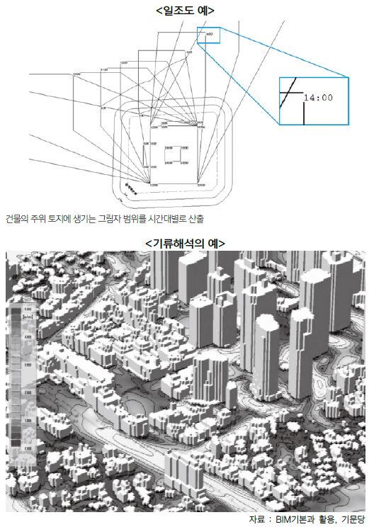 건물 주변의 대지나 주위에 건물이 있는 경우에는 벽면이나 지붕 등에 어떤 그림자가 생기는지, 또 건물 내부에 창을 통해 어느 정도로 태양광이 들어오는지를 시뮬레이션을 통해 예측할 수 있다. 건축설계용 BIM 소프트웨어의 대다수는 개략적인 일조검토를 할 수 있는 기능이 탑재되어 있어 일조시뮬레이션을 통해 기획 단계부터 설계품질의 향상을 위해 활용할 수 있다.