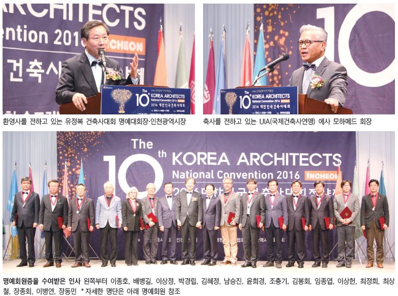 유정복 인천광역시장은 환영사에서 “건축은 우리 생활이자 삶의 터전이 된다. 국민 행복의 지표가 돼 감동을 주고 도시경쟁력을 있게 한다”며 “2016 대한민국건축사대회가 건축문화 재창조에 역할을 하며, 건축사 여러분들이 긍지와 자부심을 갖고 새로운 내일의 희망을 위해 힘차게 나아가게 되길 바란다"고 말했다.