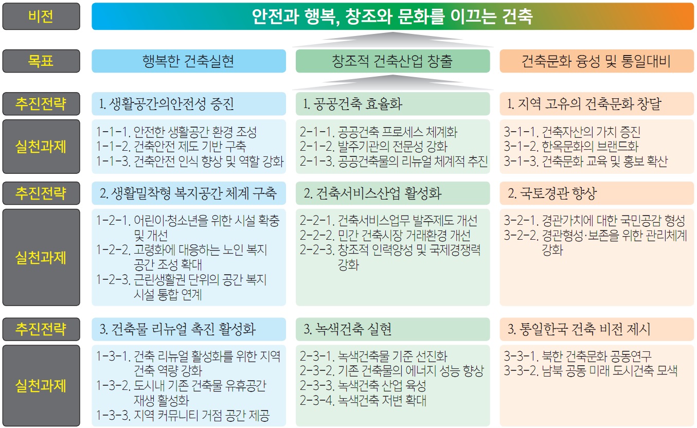 2차 건축정책 기본계획은 ‘안전과 행복, 창조와 문화를 이끄는 건축’이라는 비전 아래, ‘행복한 건축 실현’, ‘창조적 건축산업 창출’, ‘건축문화 융성 및 통일대비’의 3대 목표로 73개 단위실천과제로 구성돼 있다.