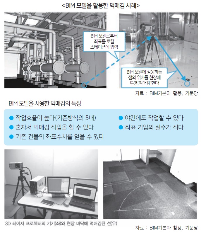 하지만 BIM데이터의 위치정보와 토털 스테이션 등의 측량기기를 연계해 BIM데이터 내의 좌표점을 가시광 레이저에 의해 핀포인트를 현장 바닥에 조사하여 보다 스마트한 방법으로 먹매김을 시행할 수 있다.