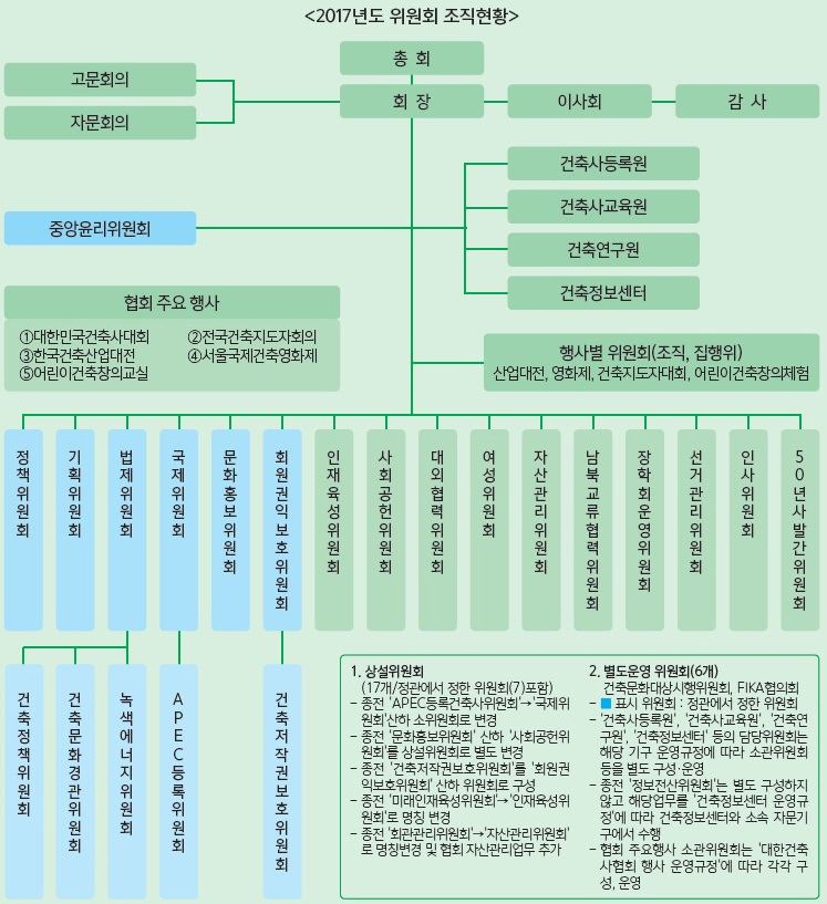 올해 운영되는 상설위원회는 정관이 정한 위원회 7개를 포함한 17개로 구성됐다. 기존 ‘미래인재육성위원회’는 ‘인재육성위원회’로, ‘회관관리위원회’는 ‘자산관리위원회’로 명칭이 변경됐으며, ‘APEC등록건축사위원회’는 ‘국제위원회’ 산하 소위원회로 변경됐다. ‘문화홍보위원회’ 산하 위원회이던 ‘사회공헌위원회’는 별도로 분리됐으며, ‘건축저작권보호위원회’는 ‘회원권익보호위원회’ 산하 소위원회로 구성됐다. 이 밖에도 비상설위원회와 별도위원회 등도 구성됐다.