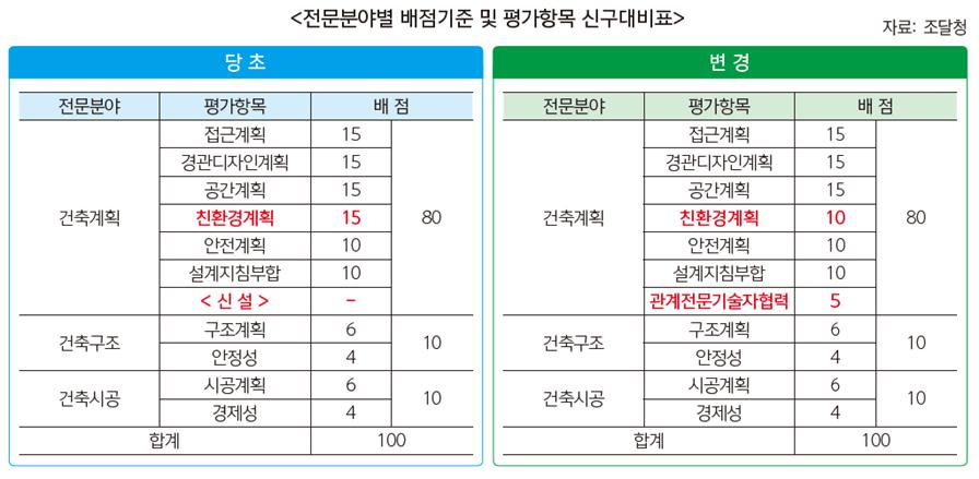 전문분야별 배점기준 중 건축계획 분야 평가항목에 ‘관계전문기술자 협력’이 추가되면서, 설계설명서에 ▲전문분야 설계 품질확보 계획 ▲협력업체 적정대가 지급 계획 ▲기타 상호 협력 방안 등에 대한 제안사항을 명시토록 했다. 조달청은 작성 예시안으로 ▲협력업체의 기술력과 설계품질을 담보할 수 있는 방안 등을 담은 ‘협력업체 선정기준 제시’ ▲표준하도급계약서 작성·제출, 공종별 협의체 구성 등을 포함한 ‘협력업체 관리 계획’ ▲적정 대금지급 계획 등을 들며, 지침범위 내에서 공모 참가자가 창의적인 양식과 방법으로 제안하면 된다고 밝혔다.