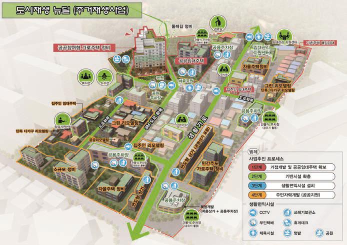 새 정부의 도시재생 뉴딜정책의 특성은 크게 네 가지로 압축된다. ▶ 주거문제 해결을 위한 재정지원 강화 ▶ 소규모, 단위사업 중심의 접근 ▶ 농어촌 등 기존 도시재생의 사각지대 포함 ▶ LH, SH 등 공기업 및 기금 역할 확대다.