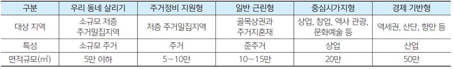 기본적으로 지역이 주도하고 정부가 지원하는 방식으로 추진되며, 기존 도시재생사업의 단위사업 규모를 줄여 대규모 철거 없이 소규모생활밀착형 시설을 설치하는 방식이 될 전망이다.