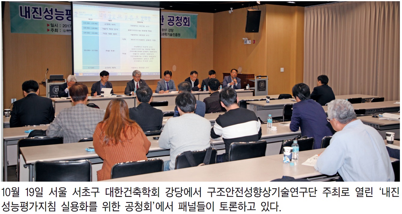 기존건축물을 대상으로 한 내진성능 평가방법, 기술적 절차를 통일화·체계화하기 위해 ‘기존 건축물 내진성능평가지침’을 법제화할 필요가 있다는 의견이 제기됐다. 9·12 경주지진 이후 기존건축물에 대한 내진성능 확보가 시급한 과제로 떠오르면서 현재 학교시설을 중심으로 내진보강이 이뤄지고 있지만, 법으로 규정된 혹은 업계 전체적으로 합의된 기술적 절차가 명확하지 않아 기술적 기준·절차를 통일시켜 관련지침을 법제화하자는 의견이다.