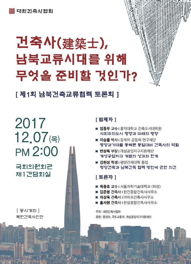 대한건축사협회 남북교류협력위원회는 12월 7일 오후 2시부터 국회의원회관 제1간담회실에서 제1회 남북건축교류협력 토론회 ‘건축사(建築士), 남북교류시대를 위해 무엇을 준비할 것인가?’가 개최된다고 밝혔다. 이번 토론회는 대한건축사협회가 주최하고 통일부, 국토교통부, 개성공업지구지원재단이 후원한다.