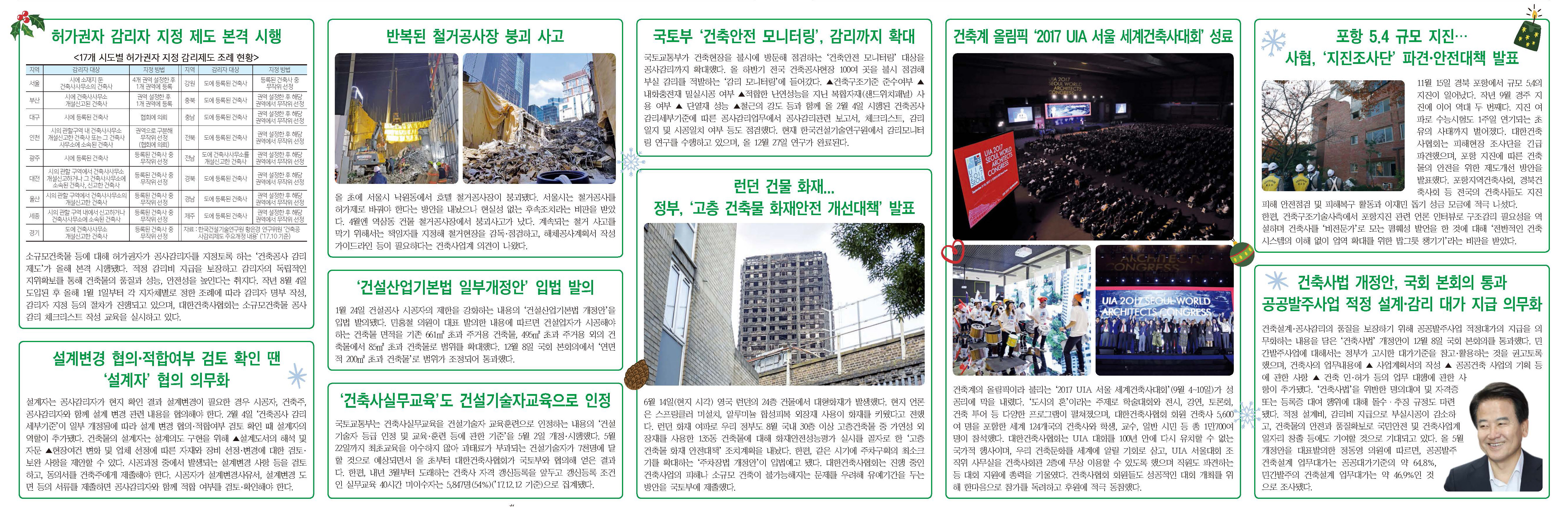 새로운 희망과 기대 속에서 시작했던 정유년(丁酉年)을 보내고 다가올 무술년(戊戌年) 새해를 맞이할 즈음에 왔다. 본지는 한 해를 돌아보며 올해의 건축계와 대한건축사협회의 10대 뉴스를 선정했다.