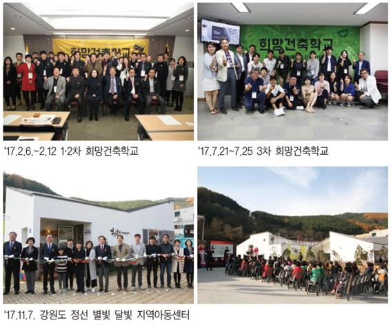 2017년에는 사업 토지가 확정된 경상북도 영덕군, 강원도 정선군, 경상북도 봉화군에서 지역아동센터 건립이 우선 추진됐다. 사협 사회공헌위는 6월까지 사업대지 선정과 희망건축학교 단원 모집을 마치고, 7월 21일부터 31일까지 제4차 희망건축학교를 실시한다고 밝혔다.