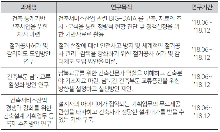 건축연구원은 남북평화협력시대를 대비하여 건축부문 교류증진 방향성과 전략을 제시하고, 건축서비스산업의 현안과 건축사의 업무환경을 지원할 제도 개선방안 마련에 진력한다. 건축연구원은 7월 12일 올해 하반기 연구과제를 속속 확정하고 시행에 들어갔다.