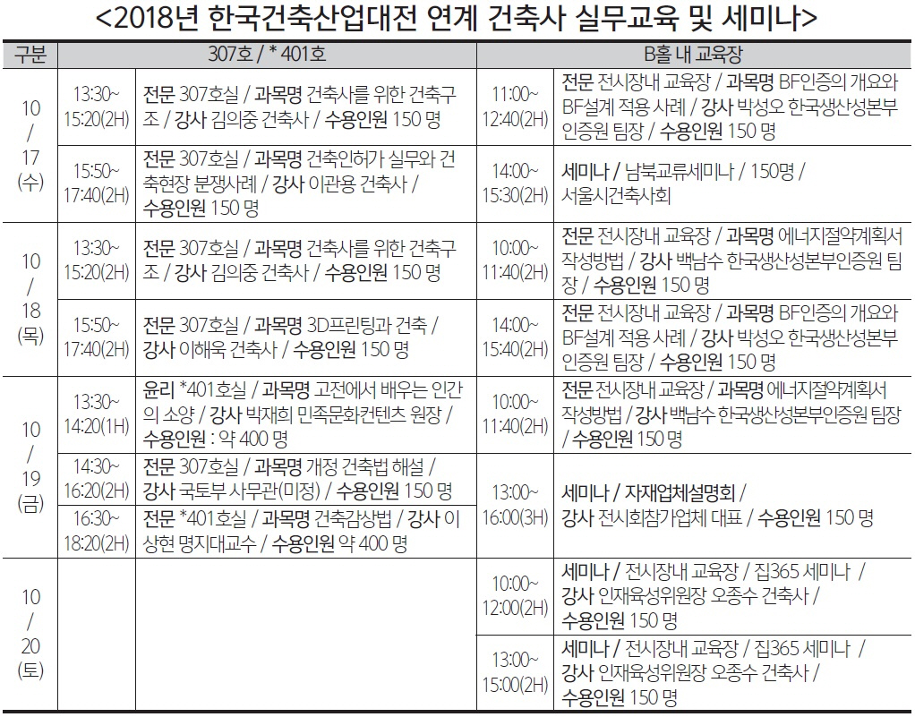 전시장 B홀 내 교육장(무료 교육)과 코엑스 세미나실 컨퍼런스룸 307호과 401호(유료 교육)에서 건축사실무교육(윤리교육, 전문교육)도 실시된다. 수강신청은 온라인으로 건축사교육원 홈페이지(www.kiraeb.or.kr)에서 10월 1일부터 16일까지 선착순으로 진행되며, 건축사 실무교육(전문) 1개 과정(3만원)을 신청하면 실무교육 1개 과정(B홀 전시장 내 교육장)을 무료로 수강할 수 있다. 교육시간이 겹치거나 동일과목 수강시 한 과목만 인정되며, 교육수강 시 출석체크를 위해 건축사등록원 등록카드 또는 수강증을 출력해 준비해야 한다.