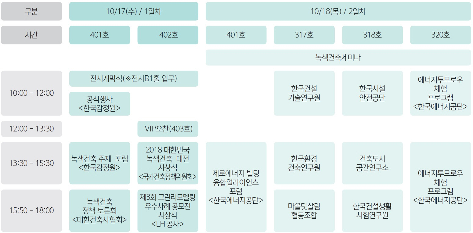 기존의 프로그램은 더욱 보완하여 양질의 전시와 교육이 이뤄질 수 있도록 했다. 예비 건축주를 대상으로 건축사가 직접 안내하고 무료 상담하는 ‘집365’ 행사도 준비되고 있다. 녹색한마당 전시와 세미나를 통한 우리나라 친환경 건축의 발전 방향과 성과를 공유할 수 있는 연관 전시, 행사. 세미나가 동시 행사로 개최되는 등 다양한 행사가 마련된다.