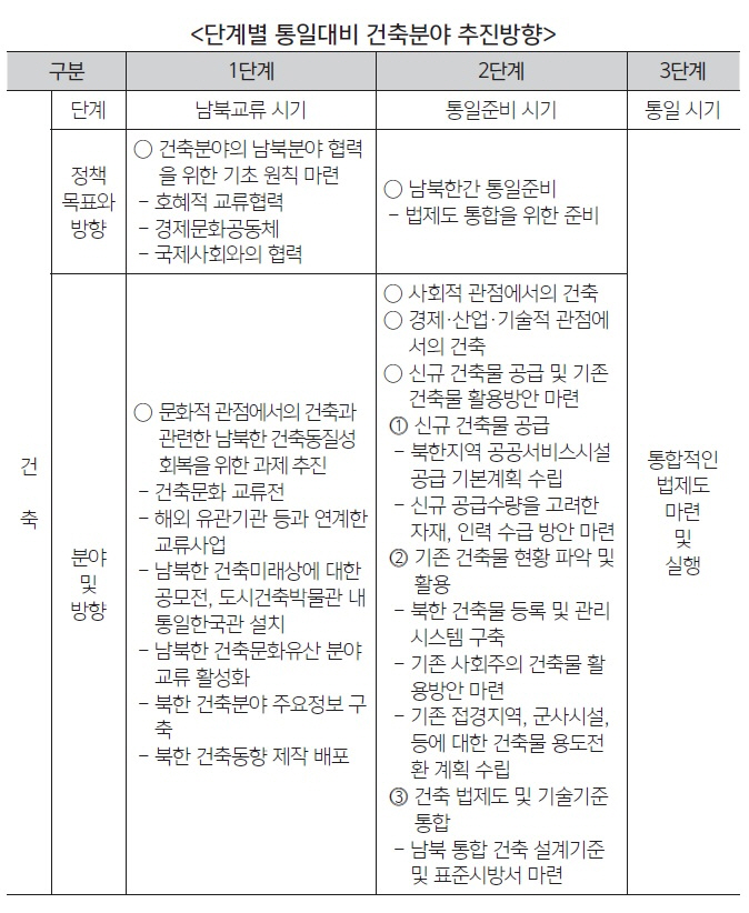 통일을 대비한 건축분야의 과제들을 소개한 엄운진 부연구위원은 “‘제2차 건축정책기본계획(2016-2020)’에 따라 북한의 건축문화자산과 근현대건축물, 북한 건축문화 실태조사를 통한 공동연구와 ‘DMZ 공동 개발 사업추진’, ‘남북 맞춤형 미래도시 개발’ 등 지역특색을 반영한 도시 및 광역교통 구축방향 연구가 진행되고 있다”고 전했다.