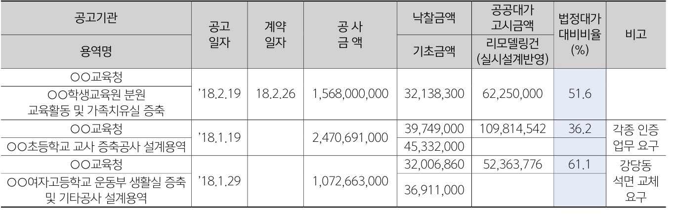조사 결과 교육청이 공고해 체결한 용역 가운데 아직도 많은 수의 용역이 법정대가 대비 50% 미만의 금액으로 계약됐다. 심지어 ○○광역시교육청이 발주한 ‘초등학교 교사 증축공사 설계용역’의 경우 공공대가가 적용되면 업무대가가 1억9백만 원이어야 하지만, 적정대가 대비 36%에 그친 3천9백만원대에 낙찰됐다.