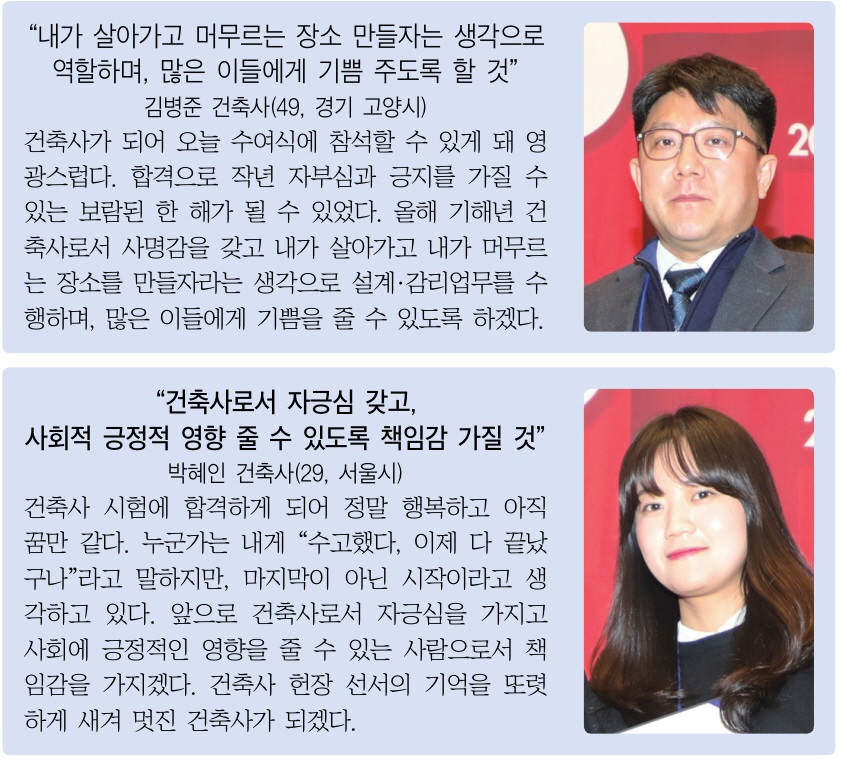 김병준 건축사는 대지계획 최고득점, 박혜인 건축사는 91년생으로 최연소 합격의 영광을 안으며, 752명 합격자를 대표해 건축사헌장을 낭독했다. 이들을 만나 합격의 소감과 건축사로서의 앞으로의 계획, 각오를 들어봤다.