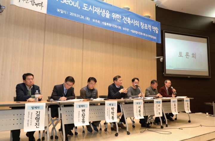 서울특별시건축사회가 1월 24일 건축사회관 1층 대강당에서 ‘In Seoul, 도시재생을 위한 건축사의 창조적 역할’ 포럼을 개최했다. 서울특별시건축사회 도시재생위원회 주관으로 열린 이날 포럼은 도시재생 사업으로 쇠퇴한 구도심을 살리고 주거환경 개선을 위한 서울시 도시재생정책에 발맞춰 건축사의 역할에 대해 논하는 자리였다. 이날 발제를 맡은 변창흠 세종대 교수는 ‘서울의 도시문제를 해결하는 도시재생 방향’을 주제로 “아직까지 표본이 될 만한 저층노후주거지 정비모델이 없는 상황에서 선도거점 개발을 통한 순환개발과 공공디벨로퍼 활용이 필요하다”고 전했다. 이밖에도 발제로 ▶ 4차 산업 시대, 빅데이터와 도시재생(공성호 SK텔레콤 미디어·홈사업부 부장, 이동옥 SKT Geovision) ▶ 도시재생사업에서의 건축과 도시계획(서울시 희망지사업 사례, 김형진 건축사_상상엔지니어링 건축사사무소) 설명이 있었다. 토론에는 서용식 서울시건축사회 도시재생위원장이 좌장을 맡고, 김형진 건축사, 변창흠 세종대 교수, 박학룡 서울장위지역 도시재생지원센터장, 송기황 서울시건축사회 도시재생위원, 홍선기 서울시 도시재생실 주거재생과장, 신길5동 도시재생희망지 사업자문역으로 활동하고 있는 장양순 건축사가 참여했다.