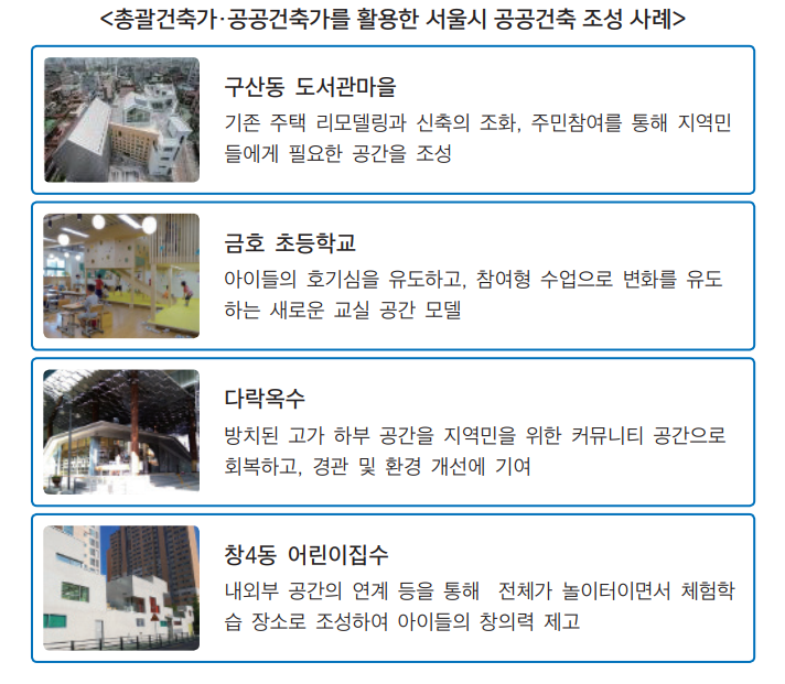 우선 정부는 우수 지역 사례를 토대로 총괄·공공건축가 제도의 전국적 확산을 도모한다. 서울특별시는 이미 총괄건축가와 공공건축가를 도입해 ‘구산동 도서관마을’과 ‘다락옥수’ 등을 조성했다. 도입 시기는 각각 2014년과 2012년이다. 경상북도 영주시도 지난 2009년 총괄건축가를 임명해 노후시설 활용 개선방향을 제시해왔다. 부산광역시도 2015년 공공건축가를 도입한 바 있다.