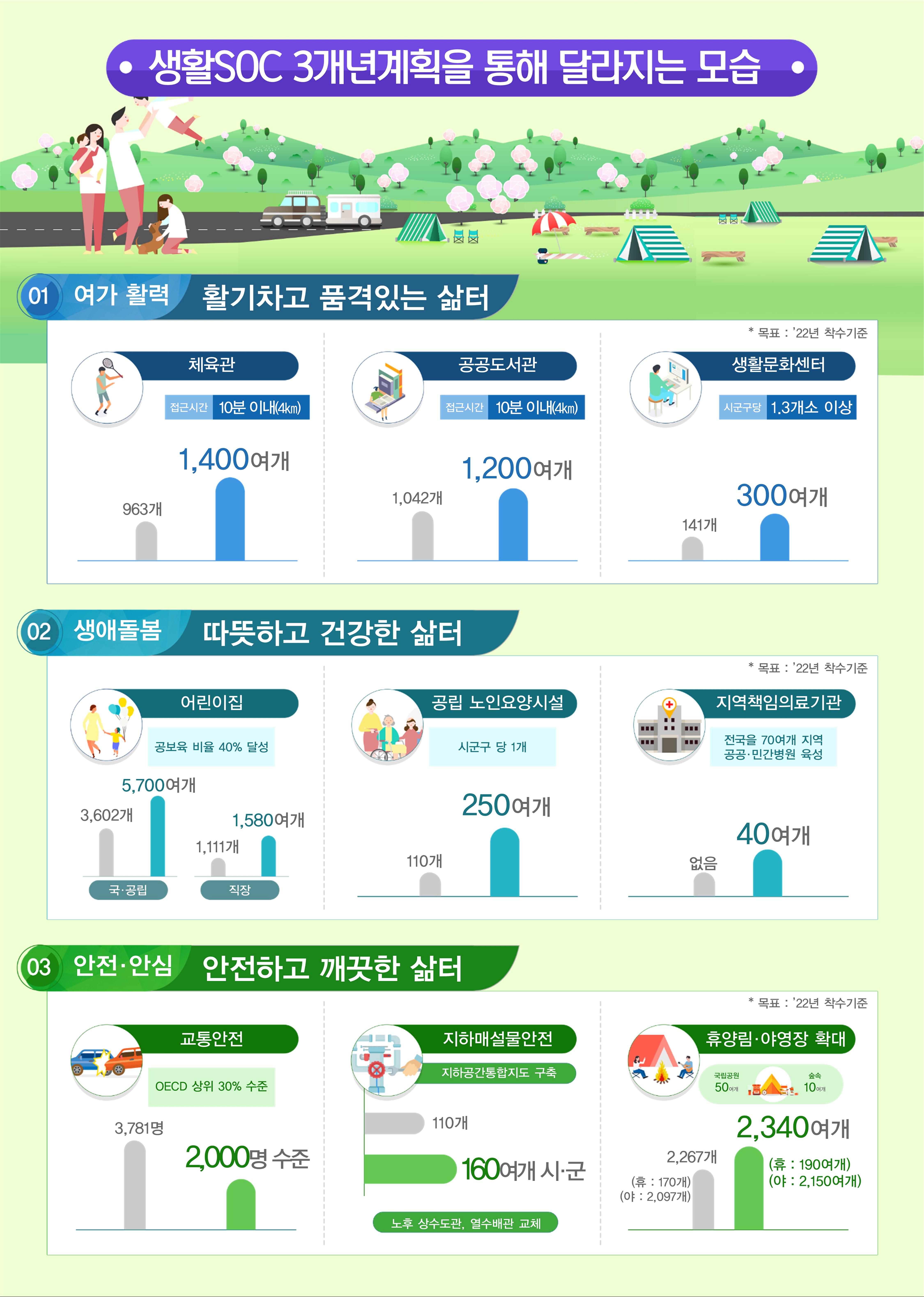 돌봄‧의료시설 분야는 유치원이나 어린이집 등의 공보육 인프라를 확충해 2021년까지 공보육 이용률을 40%로 높이는 것을 목표로 한다. 또 현재 110개소인 공립노인요양시설을 2022년까지 약 240개소로 증설해 시군구당 1개소를 두기로 했다. 주민건상센터도 현재 66개소에서 약 110개소까지 확충한다.