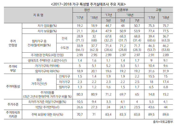 가구특성별 수치를 살펴보면, 청년가구(만 20~34세) 가운데 지하나 반지하, 옥탑에 거주하는 비율이 2.4%까지 감소했고, 최저주거기준 미달 가구 비율도 9.4%로 내려갔다. 상대적으로 목돈 마련이 어려운 청년가구는 신혼부부나 고령 가구에 비해 월세가구 비율(51.7%)이 높았고, ‘전세자금 대출 지원’을 가장 필요한 주거지원정책으로 꼽았다.
