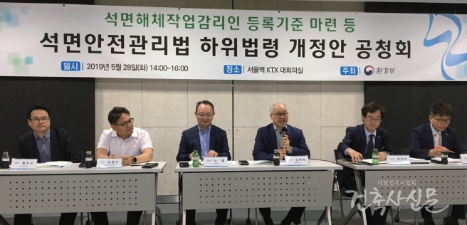 5월 28일 서울역 KTX 대회의실에서 환경부가 주최한 ‘석면해체작업감리인 등록기준 등 석면안전관리법 하위법령 개정안 공청회’가 열렸다. 공청회는 김태연 환경부 생활환경과 서기관의 석면안전관리법 하위법령 개정 취지 및 추진배경, 하위법령 주요내용 중 등록기준과 평가 절차, 향후 로드맵에 대한 발표로 시작됐다. 이후 김현욱 가톨릭대 교수를 좌장으로 ▲소태호 건축사(대호건축사사무소 대표) ▲정헌종 건축사(상진엔지니어링 건축사사무소 대표) ▲노열 전남대 교수 ▲송영신 한국석면조사기관협의회장 ▲황호순 한국석면감리협회 이사의 패널 토론이 이어졌다.