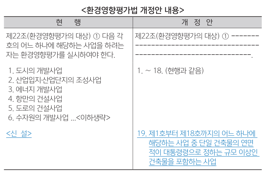 과거 중복규제라는 이유로 환경부에서 추진하다 무산된 ‘환경영향평가 의무대상에 건축물을 포함하는 법개정’이 다시 국회에서 재점화돼 주목된다.