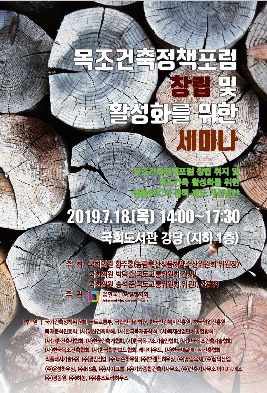 산림청과 국회의원 황주홍(농림축산식품해양수산위원회 위원장)·박덕흠(국토교통위원회 간사)·송석준(국토교통위원회 위원)이 공동 주최하고 사단법인 한국건축정책학회가 주관하는 ‘목조건축정책포럼 창립 및 활성화를 위한 세미나’가 7월 18일 오후 2시 국회도서관 강당(지하 1층)에서 개최된다.