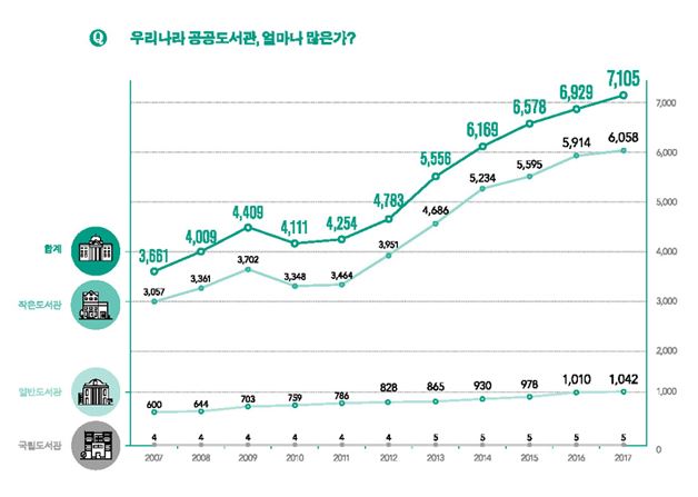 통계에 따르면 2007년 3,661개에 달하던 국내 공공도서관은 2017년 7,105개로, 2배 가까이 증가했다. 특히 2010년 이후 꾸준히 공공도서관의 개소 수가 증가해왔으며 지난 10년간 연평균 증가율도 6.9%에 이른다. 2017년 전국 유형별 도서관 수는 국립도서관 5개, 일반도서관 1,042개, 작은도서관 6,058개다.