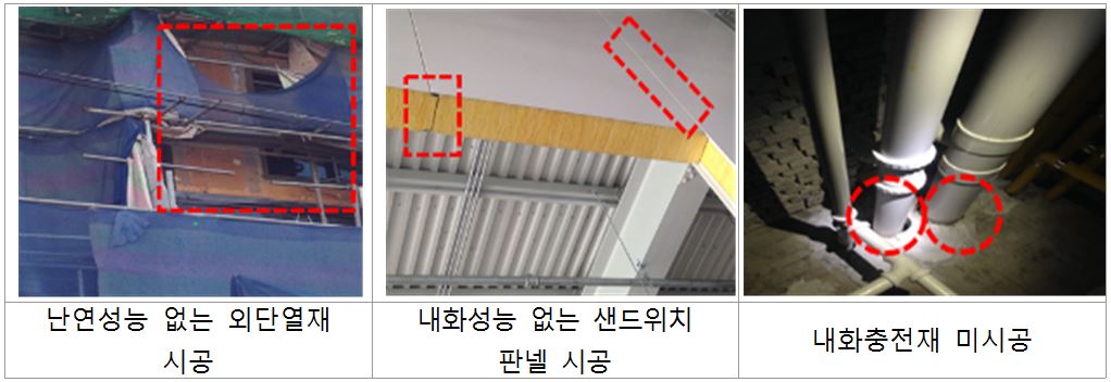 화재안전성능 미달이나 시험성적서 위‧변조 부문에서는 건물 외벽이나 1층 필로티 천장에 난연성능이 없는 단열재를 시공하거나 공장 등에 샌드위치패널 시공, 배관 관통부위에 내화충전재 미시공 현장 등이 적발됐다. 또 지난 2017~2018년 전국 229개 지자체에 제출된 건축자재 시험성적서 2만5120건에 대한 진위여부를 조회한 결과 126개 업체에서 위‧변조 사례 총 211건이 드러났다. 무자격자가 품질검사성적서를 발급하거나 필수 기재사항을 누락한 시험성적서 사례도 있다.