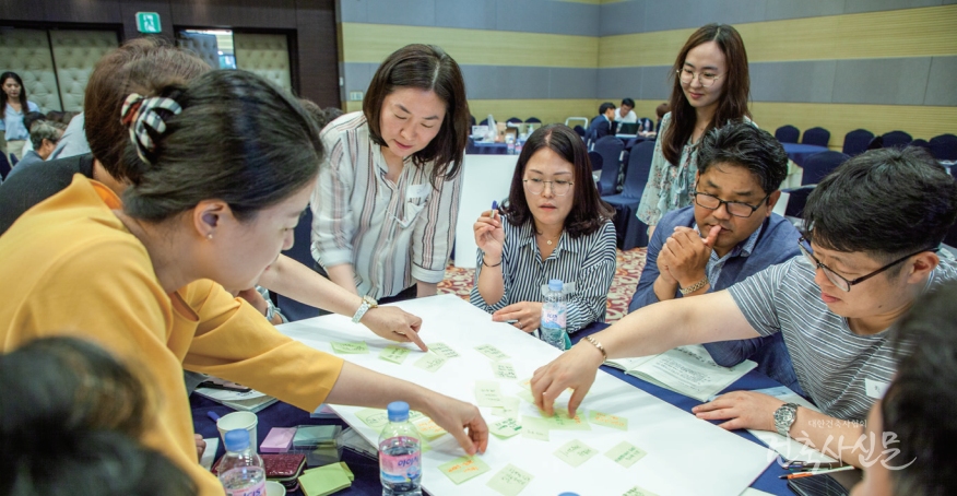 휴식 후 이어진 마지막 교육은 ‘학교공간혁신을 위한 참여 디자인 워크숍’을 주제로 문정석 (사)도시연대 커뮤니티디자인센터장 및 고인룡 공주대 건축학부 교수와 보조강사 등이 모둠별 참여수업을 진행했다. 교육 이수자들은 앉아있는 각 테이블 별로 학생, 교사, 학부모, 지역주민 등 역할을 나누어 역할극을 진행하며 각자의 입장에서 어떤 학교를 원하는지 의견을 모으고 학교공간 개선을 위한 토의를 진행했다. 이들은 의견 및 아이디어 제시, 구조화, 현실적으로 반영할 수 있는 부분 집어내기, 의견조율 등의 과정을 거치며 ‘학교공간혁신 촉진자’의 역할을 일부나마 몸소 체험하는 시간을 가졌다.