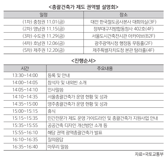 권역별 설명회는 11월 1일 충청권(대전)을 시작으로 11월 15일 영남권(대구), 11월 29일 수도권(서울), 12월 6일 호남권(광주), 12월 20일 제주권(제주)에서 순차적으로 개최된다. 설명회는 공공건축 혁신의 주체인 지역 공무원과 건축사 등을 대상으로 하며, 공공건축의 변화가 만들어낼 미래에 관심있는 시민이라면 누구나 참석할 수 있다.