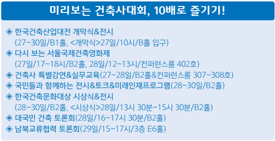 28일(목) B2홀에서 오후 4시부터 한시간 반 동안은 ▲‘대국민 건축 토론회’가 진행될 예정이다. 관련 공무원 및 유관단체 관계자, 교수, 학생, 일반인 누구나 참석해 자유롭게 건축의 과제 등 의견을 나눌 수 있다. 일부 전시와 연계되며 전시와 토론 및 토크쇼·국민참여 행사등을 아우르는 ▲‘미래인재프로그램’도 주목할 만하다. 전시는 28일(목)부터, 토론 등의 행사는 29일(금) 오전 10~11시·오후 1시~1시 반·1시 반~6시로 나뉘어 진행되며, 동시에 29일(금) 오후 3시 반부터 5시까지 컨퍼런스룸 E6호(3층)에서 ▲‘남북교류토론회’가 열린다. 30일(토)에는 일반인을 대상으로 한 ‘도전, 건축골든벨’, ‘집365’ 등 건축 관련 흥미를 돋우는 행사가 준비돼 있다.