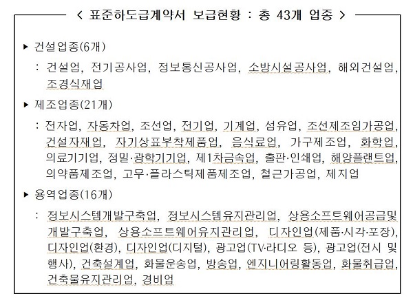 공정거래위원회(이하 공정위)는 11월 24일 건축설계업종 등 15개 업종 표준하도급계약서를 제‧개정했다고 밝혔다. 표준하도급계약서는 원사업자에 비해 힘이 약한 하도급 업체의 권익보호를 위해 양자간의 거래 조건이 균형있게 설정될 수 있도록 공정위가 보급한 계약서다. 현재 건축설계업종, 건축물유지관리업 등 43개 업종을 대상으로 보급되어 있다.