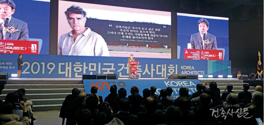 향후 건축문화대상이 나아가야 할 길에 대한 따뜻한 조언도 있었다. 이성관 2019 대한민국건축사대회 조직위원장은 “순수예술은 그 자체로 자기를 표현하는 개인적인 행위이지만 건축은 사회적 관계에서 창조되는 것이다”며 건축의 중요성을 환기하고, “시상식이 축제 분위기를 이어가고 품위를 높이는 부분이 중요하고, 수상작의 설명을 듣기로 한 변화된 모습을 보인 오늘이 그 출발점이라고 말할 수 있다”고 밝혔다.