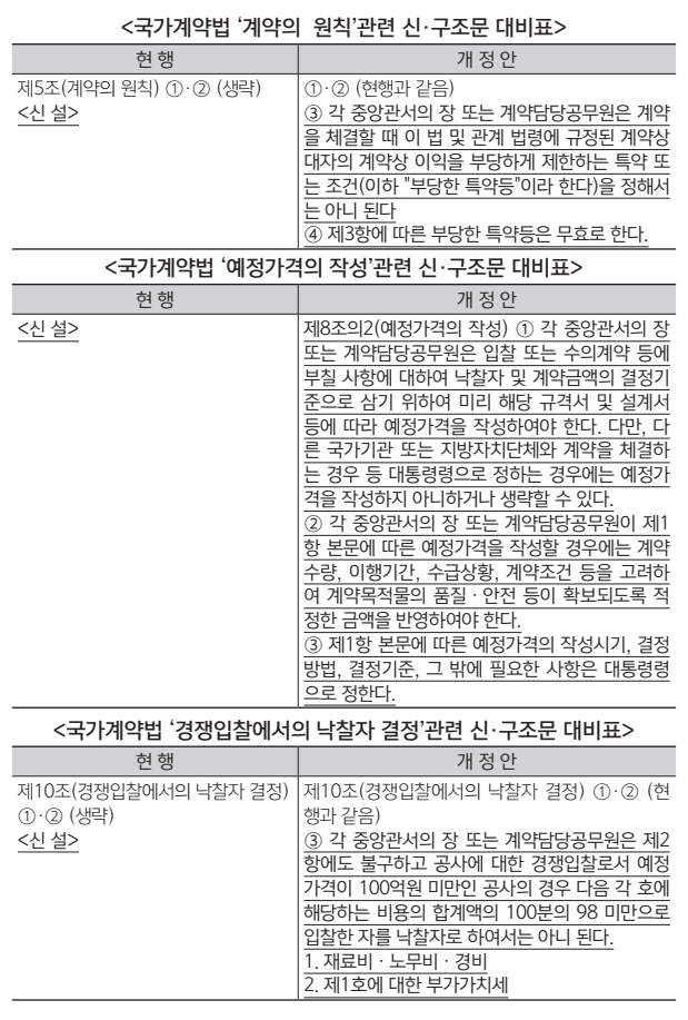 법제처는 “100억원 미만의 경쟁입찰에 관한 신설된 10조 3항의 경우 계약금액이 실제 공사에 소요되는 순공사원가에 상응하도록 하는 제도적 장치를 마련한 것”이라고 의미를 밝혔다.