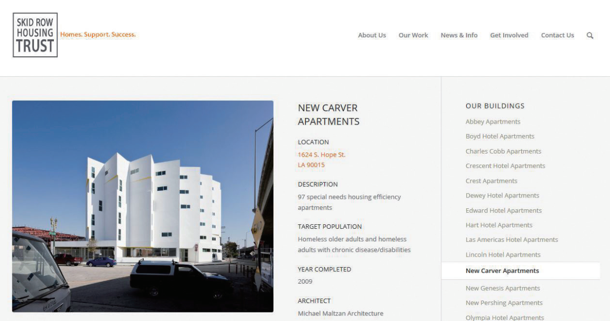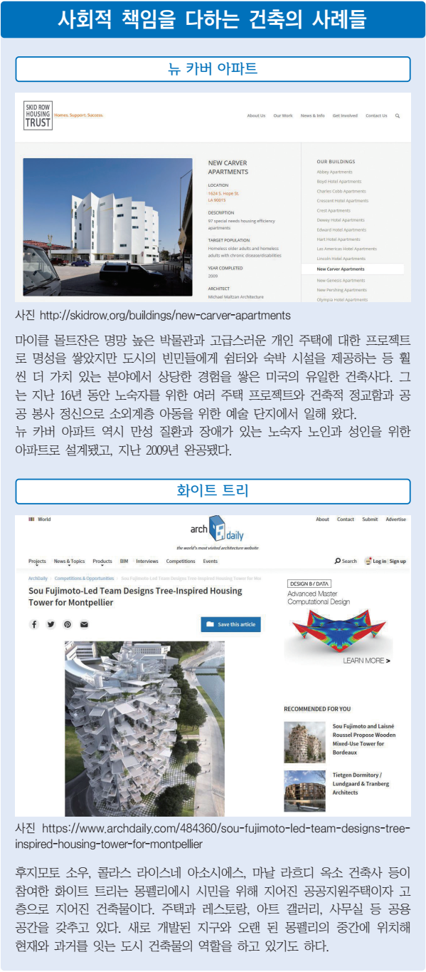 사회적 책임을 강조하는 건축의 사례도 늘어나고 있다. 해외사례로서 미국의 건축사인 마이클 몰트잔(Michael Maltzan)은 명망 높은 박물관과 고급스러운 개인 주택 프로젝트로 명성을 쌓았지만 최근에는 도시의 빈민들에게 쉼터와 숙박시설을 제공하는 데에 훨씬 더 가치를 부여하고 있다. LA 카운티 보건부의 응급처치를 자주 이용하는 노숙자들에게 주택을 제공한 크레스트 아파트나, 만성질환과 장애가 있는 노숙자 노인과 성인을 위한 공공주택인 뉴 카버 아파트 등이 그의 애정과 열정이 담긴 대표작이 되고 있다.